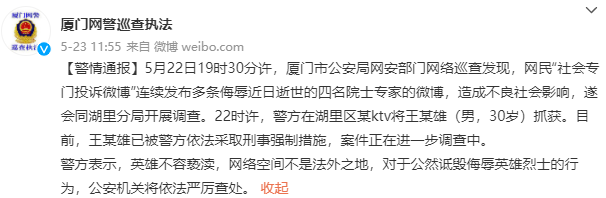5月22日,福建厦门网警发现,网民“社会专门投诉微博”连续发布多条侮辱近日逝世的四名院士专家的微博,造成不良社会影响。当日晚间22时许,警方抓获该网民王某雄,并对其采取刑事强制措施。