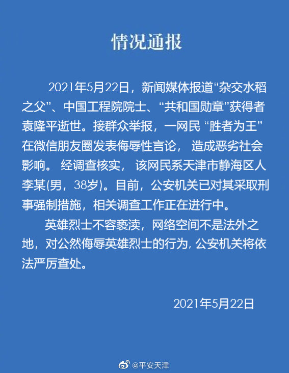 5月22日,天津警方通报称,网民“胜者为王”在社交媒体发布针对袁隆平院士逝世的侮辱性言论,警方依法对其采取刑事强制措施。