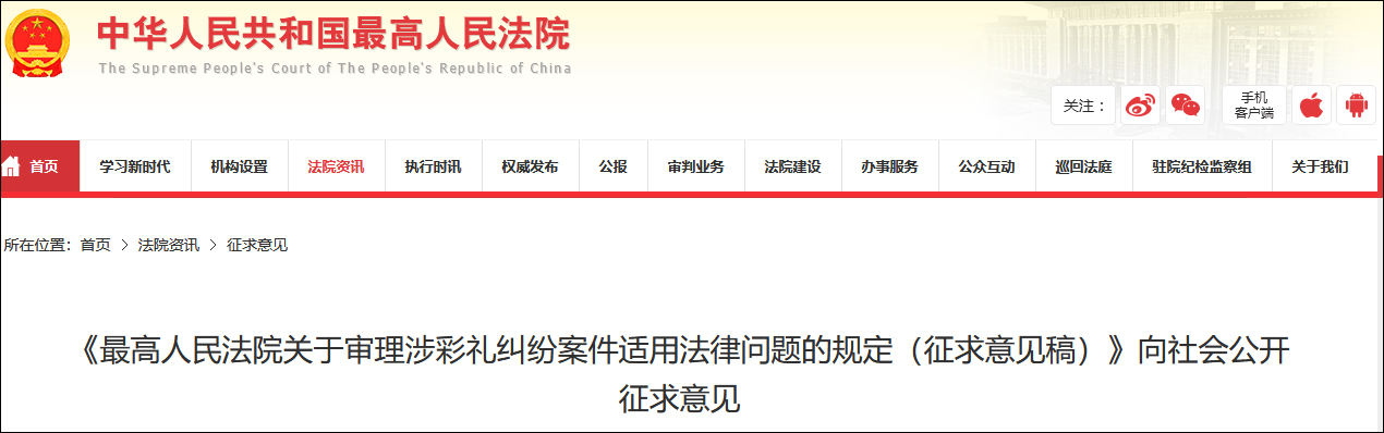 12月11日,《最高人民法院关于审理涉彩礼纠纷案件适用法律问题的规定(征求意见稿)》发布,向社会公开征求意见。