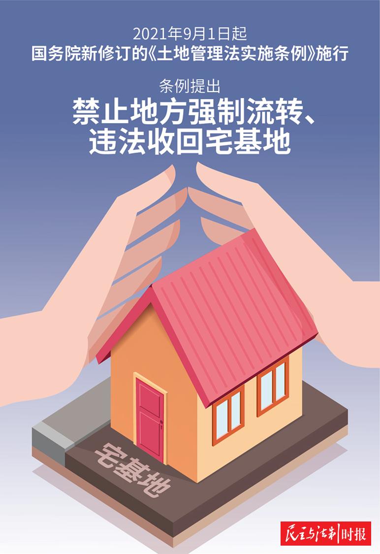《土地管理法实施条例》第三十六条规定:“依法取得的宅基地和宅基地上的农村村民住宅及其附属设施受法律保护。禁止违背农村村民意愿强制流转宅基地,禁止违法收回农村村民依法取得的宅基地,禁止以退出宅基地作为农村村民进城落户的条件,禁止强迫农村村民搬迁退出宅基地。”