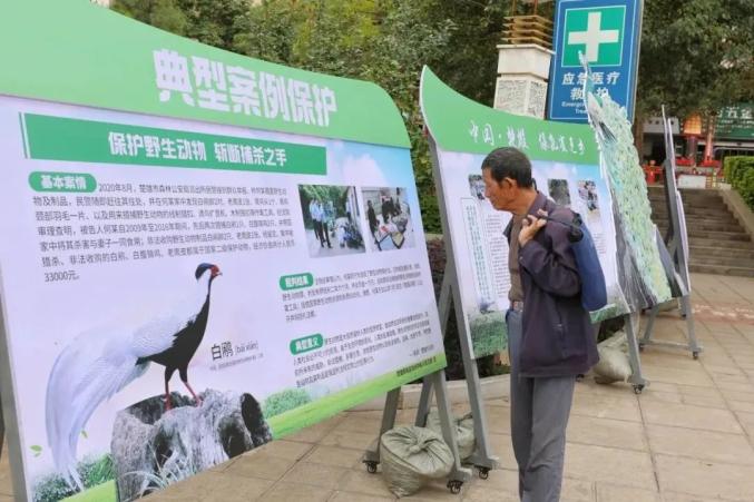 活动中,楚雄法院法官干警结合宣传展板和宣传资料生动的图文展示,加以具体的案例讲解,将如何识别绿孔雀、如何保护绿孔雀以及危害珍贵濒危野生动植物的法律责任等法律知识向群众普及。