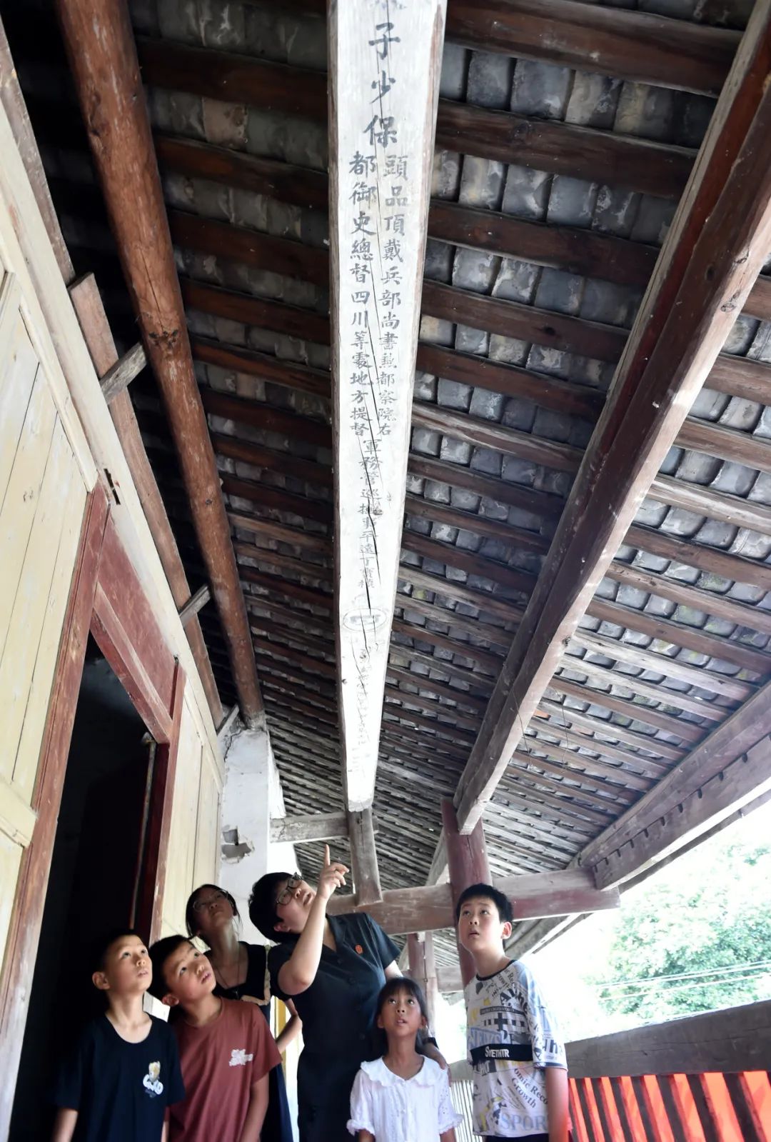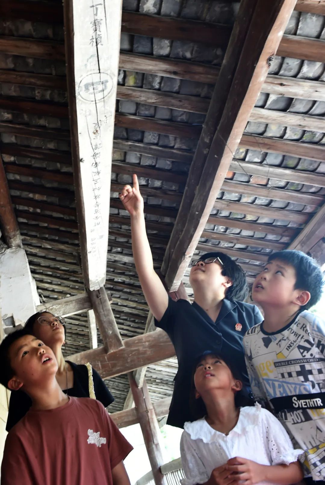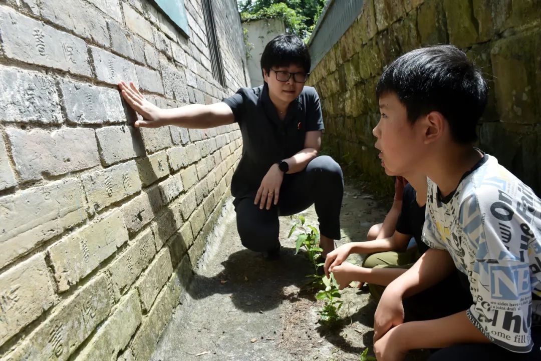 ▲孩子们在志愿者引领下查看留存的古代建筑题刻。认识家乡曾经也是藏龙卧虎之地,增强出路自信、文化自信。