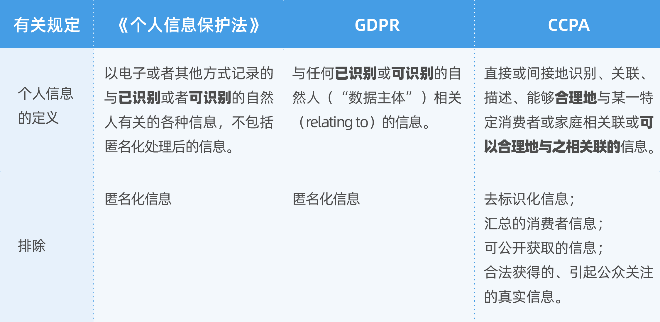 而CCPA(California Consumer Privacy Act,即美国加州隐私保护法)则采用定义、列举、排除并行的方式对个人信息进行界定,强调“合理性”,进一步限制了个人信息的范围,CCPA排除适用的信息类型也远远多于GDPR与《个人信息保护法》。三者具体比较可参见下表。
