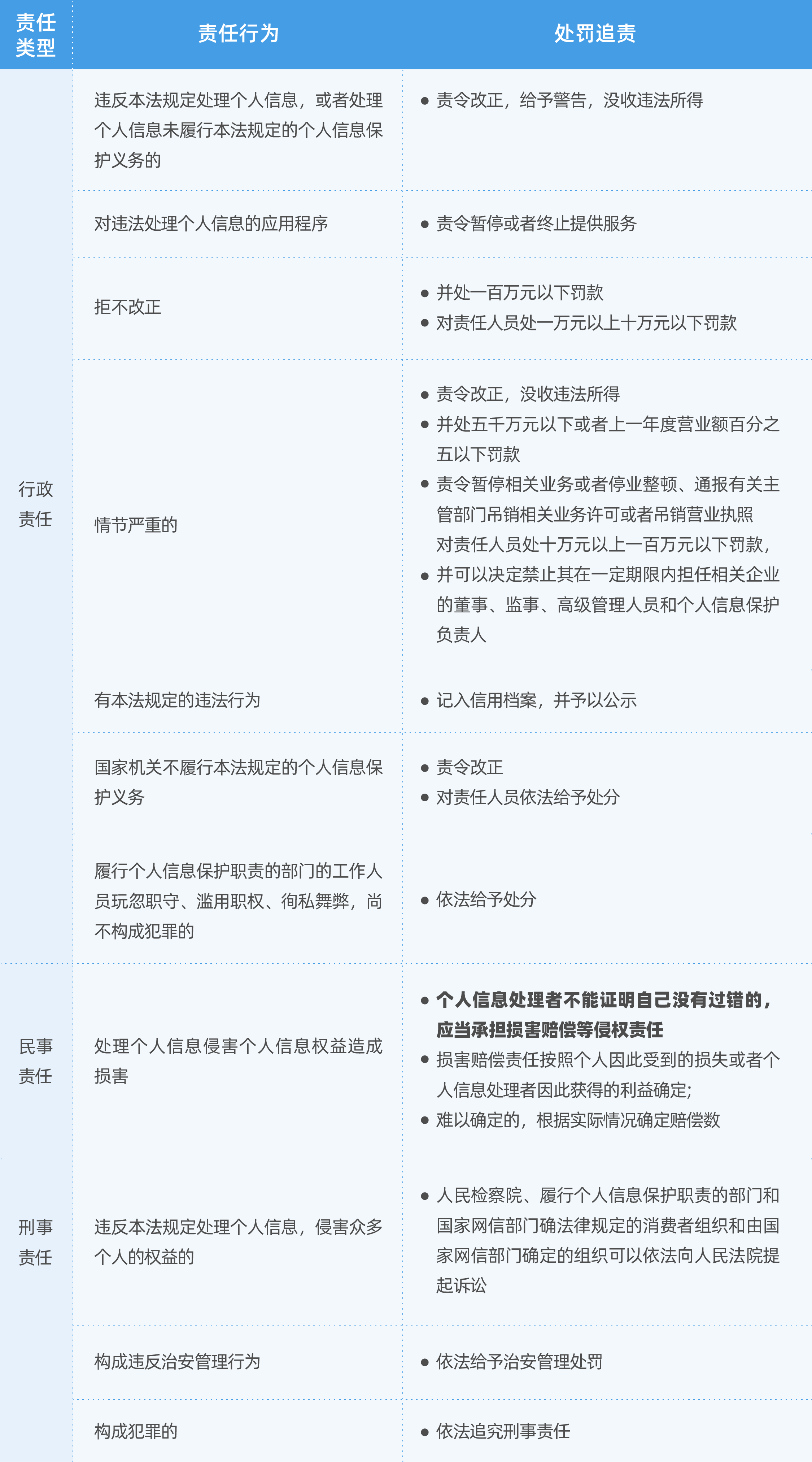 总体而言,《个人信息保护法》的责任追究体系十分完整,涵盖了民事、行政与刑事领域,且十分严厉,具体可参见下表。