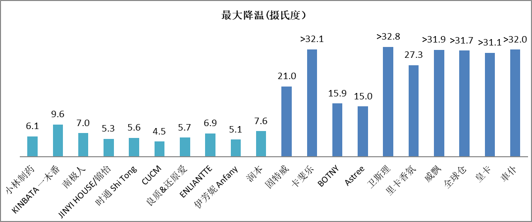 可能有小伙伴会问了,那是不是说明加压类降温喷雾降温效果更好?从测试结果看,我们发现有6件样品的降温效果超过30℃,测试温度均降低至0℃以下。这其中,有2件样品宣称可对人体皮肤使用,但没有冻伤提示: