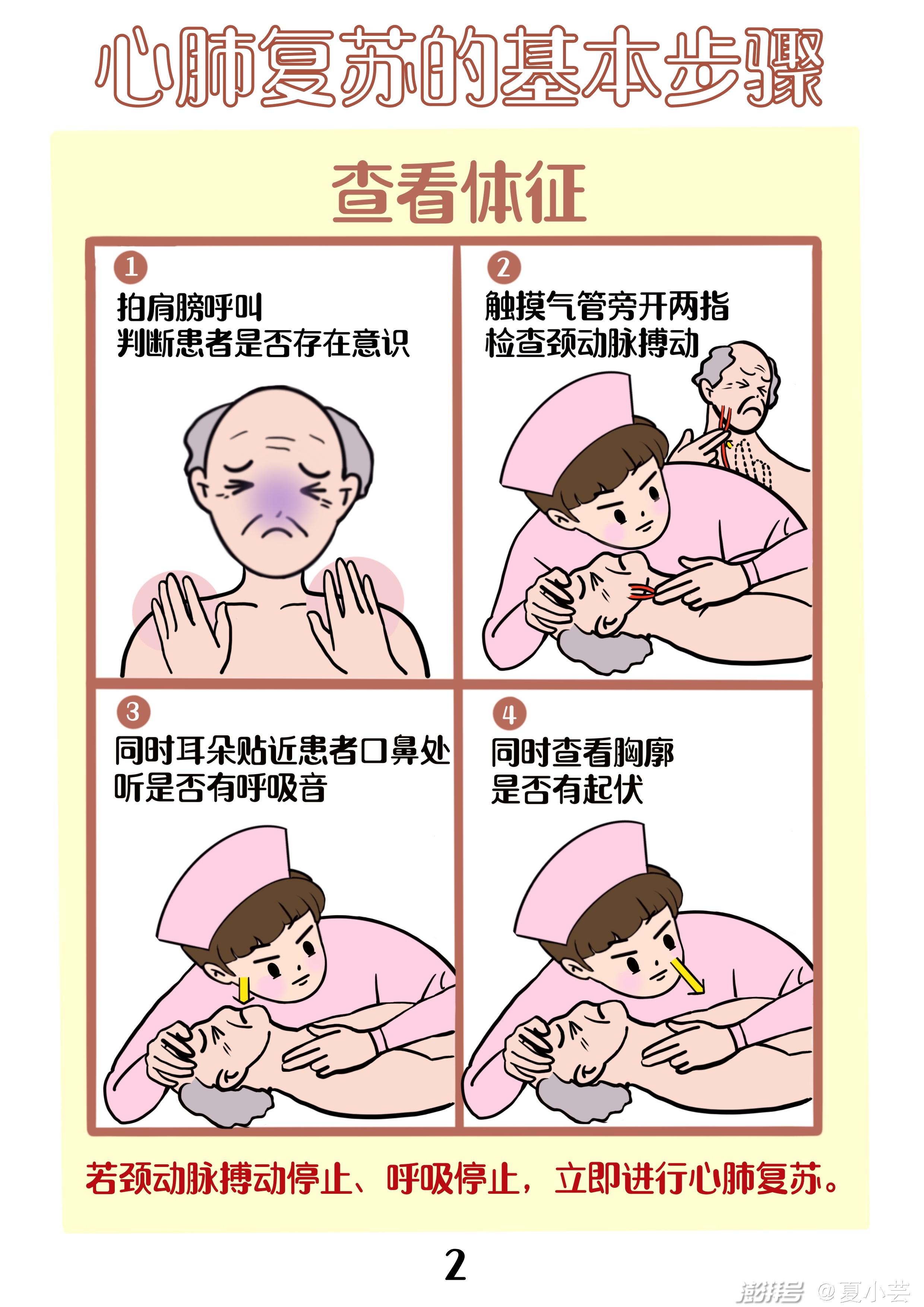 (1)立即用双手拍病人双肩,在患者耳边问:“先生(女士)!你怎么了?”若无反应,判断为意识丧失。