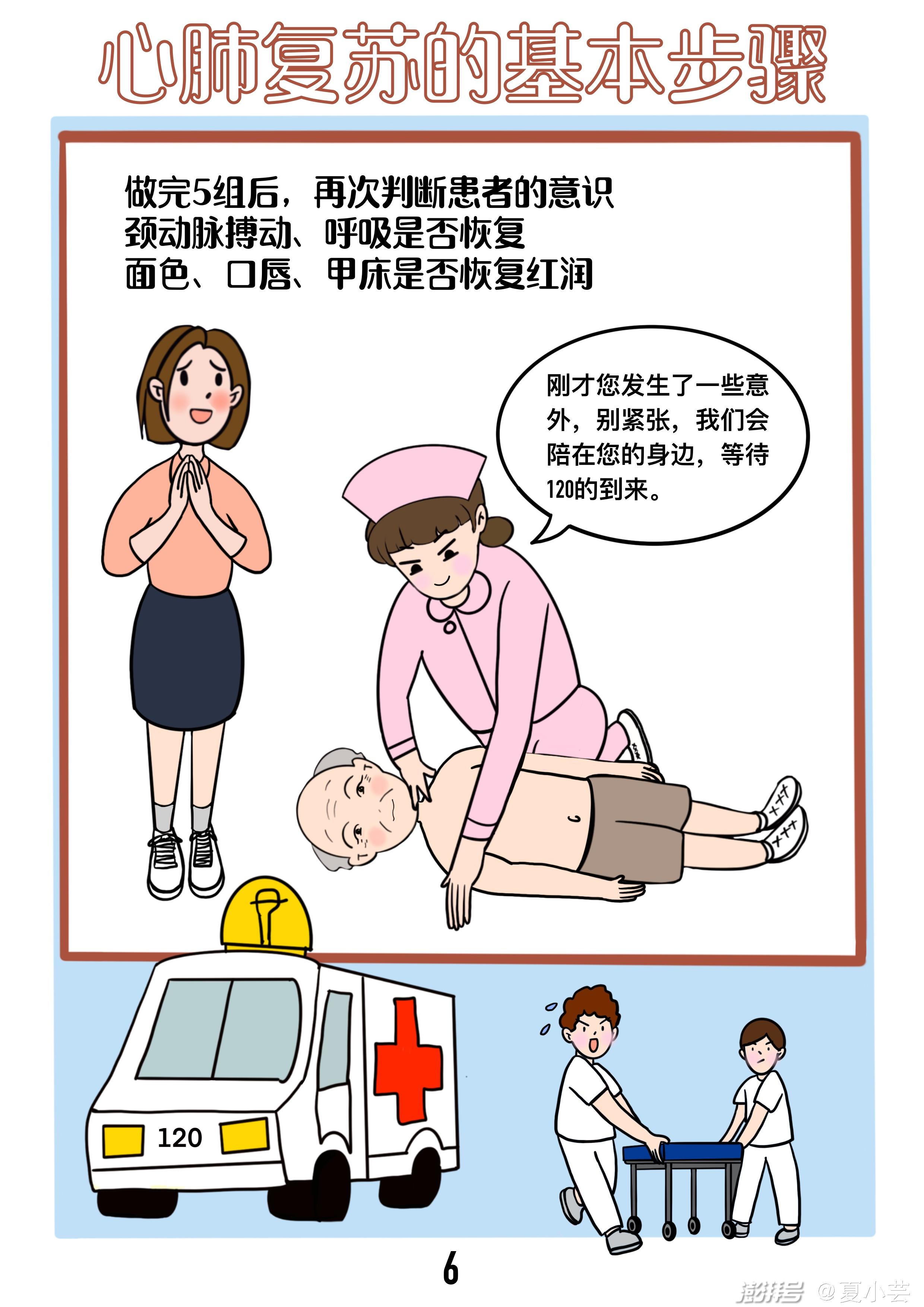 进行5个循环的心肺复苏(约2分钟)后,通过触摸颈动脉搏动,看胸廓起伏、感觉呼吸的方法,判定自主心跳及呼吸是否恢复,评估在10秒内完成。如果患者复苏成功,取平卧位,头偏向一侧,等待120送至医院进一步救治;如果复苏不成功,再次进行5个循环的心肺复苏,直至120的到来。
