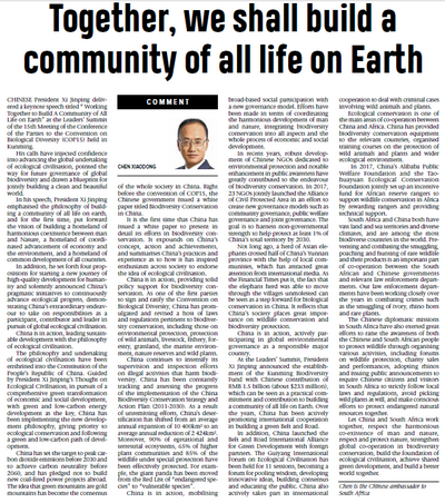 2021年10月22日,南非主流媒体《星报》《比陀新闻报》《水星报》《开普时报》刊登驻南非大使陈晓东题为《同心协力,共建地球生命共同体》的署名文章,全文如下: