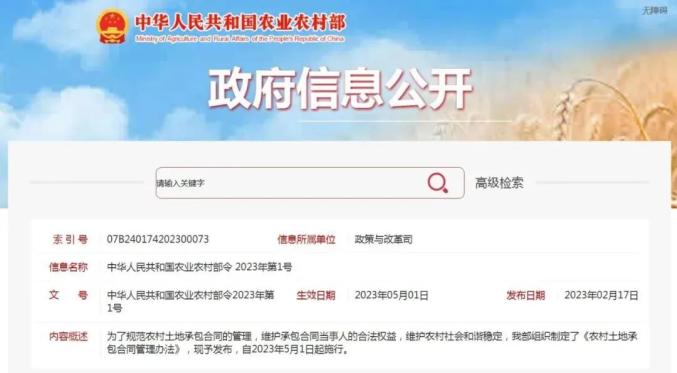 据农业农村部网站消息,日前,《农村土地承包合同管理办法》已于2023年1月29日经农业农村部第1次常务会议审议通过,自2023年5月1日起施行。