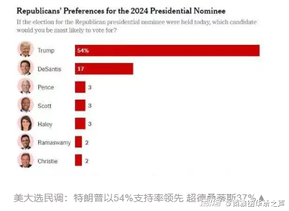 【西雅图华语电台AM1540综合讯】《纽约时报》和锡耶纳学院31日公布了一项针对共和党选民的联合民意调查结果:在所有的共和党总统竞选人中,特朗普以54%的支持率取得绝对领先地位,超出第二位德桑蒂斯37%,其余候选人支持率均未超过3%。