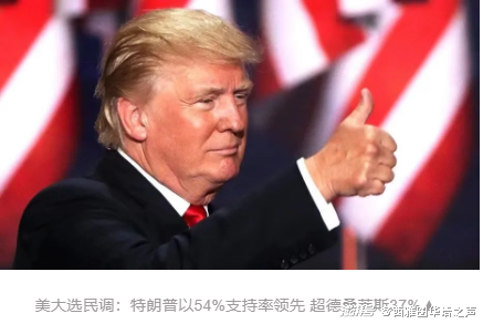 美大选民调:特朗普以54%支持率领先 超德桑蒂斯37%