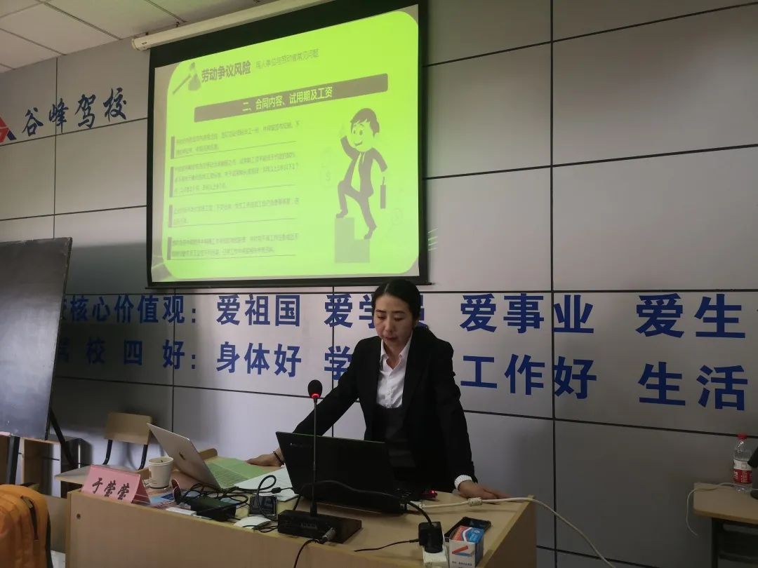 2021年5月21日,仙林街道总工会邀请职工法律援助服务站聘用律师于莹莹走进非公企业谷峰驾校,以案说法,通过一个个生动案例将《劳动法》《劳动合同法》的有关知识教授给在场职工们。
