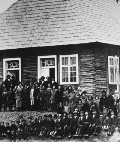 1930年,Sighe犹太社区的成员在一个犹太教堂前合影。