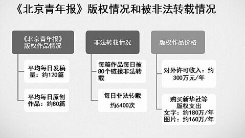 新华社的新闻作品被非法无序转载其实并不是个别现象,而是普遍、大量存在的现象。今年6月13日《中国新闻出版广电报》记者随全国人大常委会著作权法执法检查组一行到北京青年报社(集团)(以下简称北青报)检查、调研时也获悉到类似的情况。据该报总编辑余海波介绍,北青报现拥有“十报、三刊、二网、微信矩阵、微博”等新闻平台,这些媒体平台每天都刊载大量原创新闻作品,共同构成北青集团的版权资源。近年来,北青报的新闻作品被非法转载情况非常严重。仅以《北京青年报》为例,每日刊载的原创新闻作品约80篇。经北青报监控,在每天24小时范围内,平均每篇原创新闻作品被非法转载达80次(即80条链接),相当于北青报每天刊载原创新闻作品总计被非法转载达6400次。