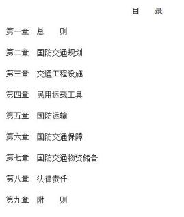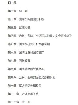 《中华人民共和国国防法》、《中华人民共和国国防动员法》、《中华人民共和国人民防空法》、《中华人民共和国国防交通法》、《中华人民共和国国防教育法》、《中华人民共和国兵役法》、《中华人民共和国军事设施保护法》和即将3月1日施行的《中华人民共和国预备役人员法》。