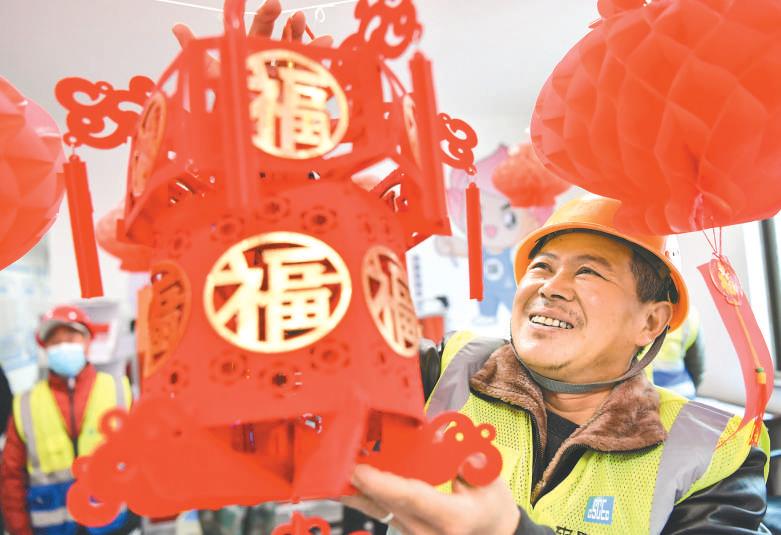 2021年元宵节,中建三局西北公司西安广安路项目部为节日期间坚守岗位的工人们准备了丰富的活动,大家一起挂灯笼、猜灯谜、包元宵,共度佳节。 新华社记者 刘潇 摄
