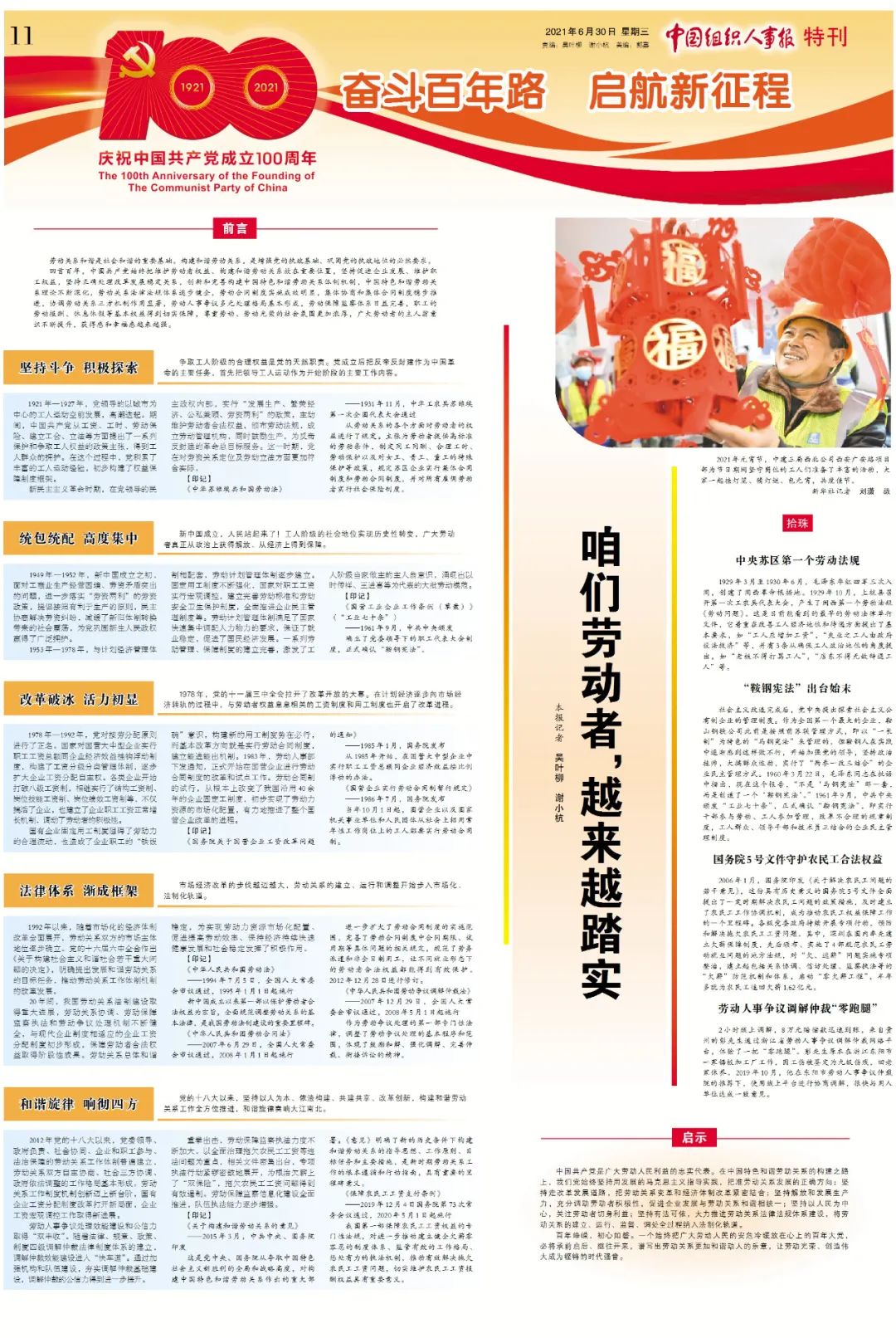百年峥嵘,初心如磐。一个始终把广大劳动人民的安危冷暖放在心上的百年大党,必将承前启后、继往开来,谱写出劳动关系更加和谐动人的乐章,让劳动光荣、创造伟大成为铿锵的时代强音。(本报记者 吴叶柳 谢小杭)