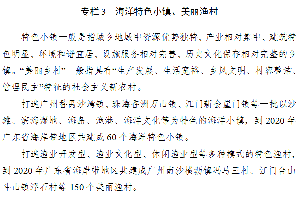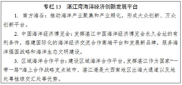产业发展。加快推进海洋经济创新发展示范城市及海洋经济示范区建设。推动钢铁、石化产业及其园区发展,建设东海岛高端临海现代制造业集群;推动海洋工程装备制造和海洋生物医药等海洋产业示范基地发展以及物流园区和产学研合作园区建设;发挥渔业资源优势,发展深加工渔业,推动远洋渔业基地建设;对接北部湾地区和海南国际旅游岛,共同打造粤桂琼滨海旅游“金三角”,将其建设成为具有国际影响的休闲度假旅游目的地。在新寮群岛、外罗水道、徐闻等海域布局海上风电,推动海上风电等新能源产业发展。