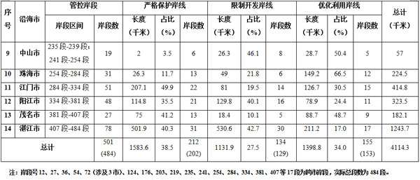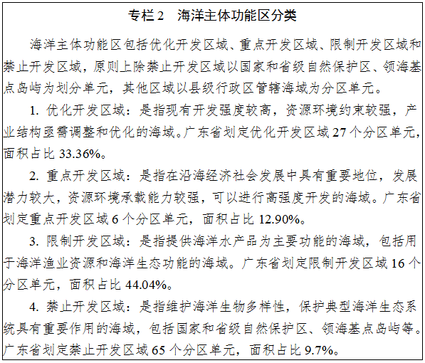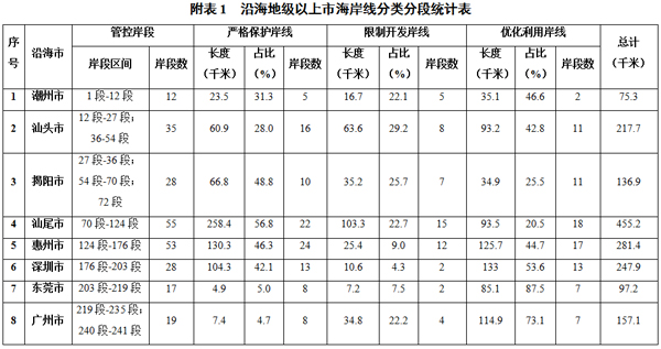 一线管控、两域对接。“一线”是指海岸线,海岸线是连接海陆功能的纽带。本规划以岸线功能为基础,按照《海岸线保护与利用管理办法》,将广东省大陆岸线划分为优化利用、限制开发、严格保护三种类型,实施分类分段精细化管控。“两域”是指陆域和海域,以海岸线为轴,统筹规划岸线两侧功能和需求,把陆地主体功能区规划与海洋主体功能区规划有效衔接。优化城镇空间布局,推进土地利用集约高效,建立实施海岸建筑退缩线制度。推进政府主导的集中集约用海,优化建设用海空间布局,推进生态用海、生态管海。整体推进海陆经济产业发展和示范,实现两域对接。
