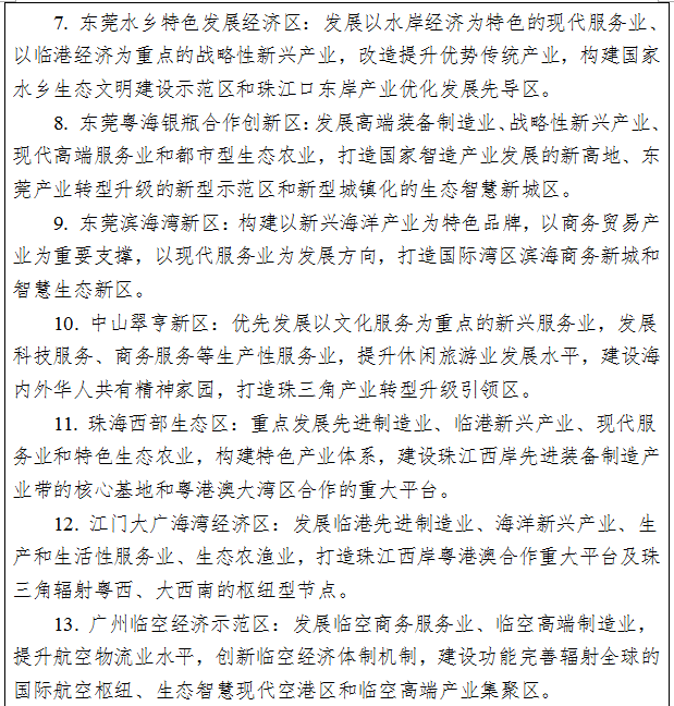 产业发展。积极落实粤港澳大湾区发展战略,发挥深圳、广州龙头带动作用,大力推进广深科技创新走廊建设,形成高度发达的创新经济带,辐射带动全省创新发展。打造全球产业创新高地,建设具有国际影响力的战略性新兴产业高地、信息经济高地、智能制造高地,重点布局在深圳、广州、珠海等地。建设世界级先进的电子信息、装备制造、石化等产业基地,重点布局在佛山、惠州、东莞、中山、江门等。重点打造全球金融中心、全球贸易中心、全球物流中心、国际化的消费中心、世界休闲旅游中心,主要布局在广州、深圳。大力发展广深珠高端制造业,支持珠海培育智能制造和战略性新兴产业,带动珠江西岸产业发展。大力建设佛山和东莞科技成果转化基地。建设惠州、中山、江门等区域生产制造基地。加快构筑区域发展重大平台。建设南海油气资源勘探开发保障基地,加快推进天然气水合物产业发展;推动江门循环经济和环保产业示范区建设;在港口、桂山、金湾等海域发展海上风电。