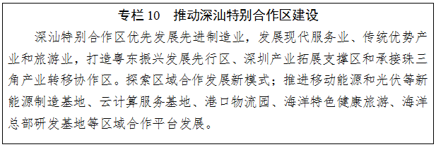 产业发展。依托深汕特别合作区,推进汕尾主动对接融入深莞惠经济圈,全面承接深莞惠经济圈辐射带动,打造珠江东岸产业转移主承接区。优先发展先进制造业和电子信息产业,提升发展传统优势产业和旅游业,优化发展现代农业,重点发展能源工业和以马宫海洋渔业科技产业园为载体的大型深加工渔业,推动汕尾临海能源工业基地建设;在甲子、后湖海域布局海上风电。