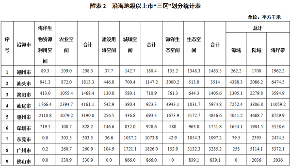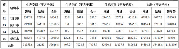 本规划所称海岸带区域范围,涵盖广东沿海县级行政区的陆域行政管辖范围及领海外部界线以内的省管辖海域范围,并将佛山部分地区和东沙群岛纳入。规划总面积11.81万平方千米,其中陆域5.34万平方千米,海域6.47万平方千米,海岛1963个,涉及地级以上市15个,县(市、区)56个,镇(乡)727个,人口约7000万。