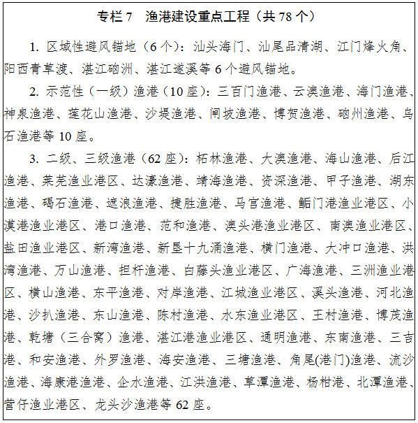 港口发展。推进大南海港区、广东神泉现代渔港区、前詹港区、资深港区、靖海港区建设,以发展现代渔业、能源、原材料和通用散杂货运输为主,推动石油化工、装备制造等大型临港产业发展。