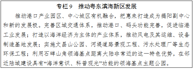 产业发展。积极推进揭阳大南海石化工业区、风能成套装备产业园、海洋高端装备产业园等平台建设;重点发展石化、新材料、电力、装备制造、生物医药、电子信息、现代渔业等产业;加快度假、养生、养老等旅游产品开发,推进靖海等地区海水增养殖发展。在神泉、靖海海域布局海上风电。