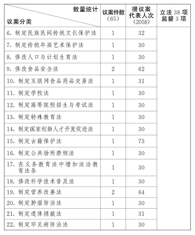 金硕仁等30名代表提出的关于提请全国人大常委会实施有关教育的“三法”执法检查,切实推动教育改革的议案1件(第455号)。议案指出,加强对教育法、教师法、高等教育法等教育法律实施情况的执法检查,是确保教育领域综合改革依法务实推进的重要举措。