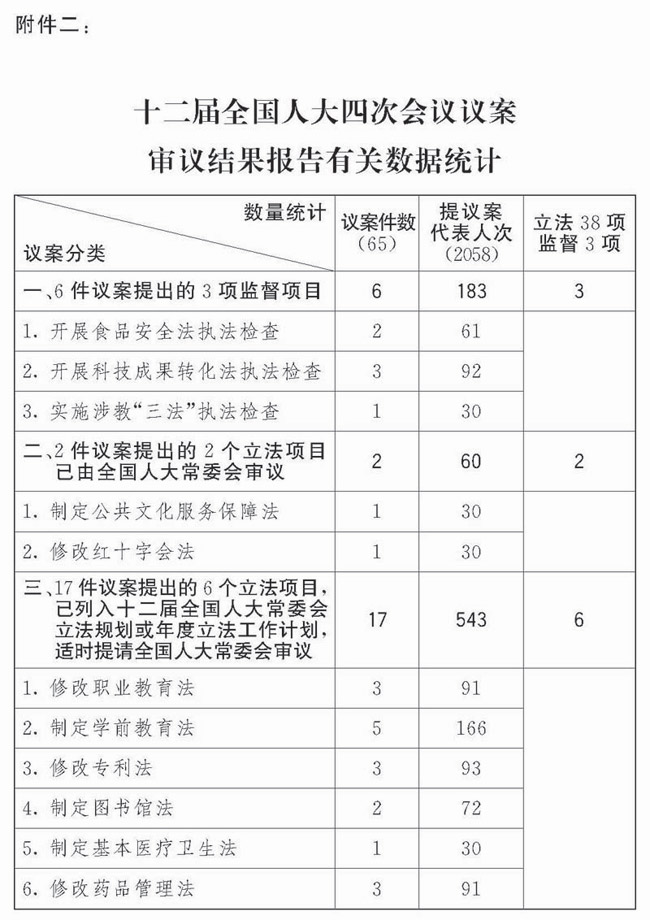 附件二:十二届全国人大四次会议议案审议结果报告有关数据统计
