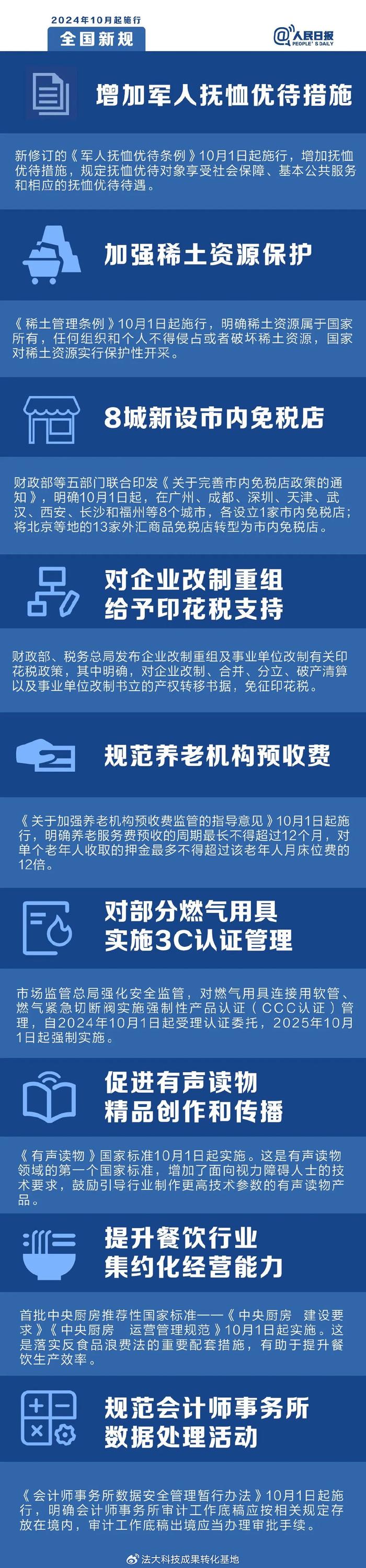 民政部等七部门出台的《关于加强养老机构预收费监管的指导意见》,自2024年10月1日起施行。