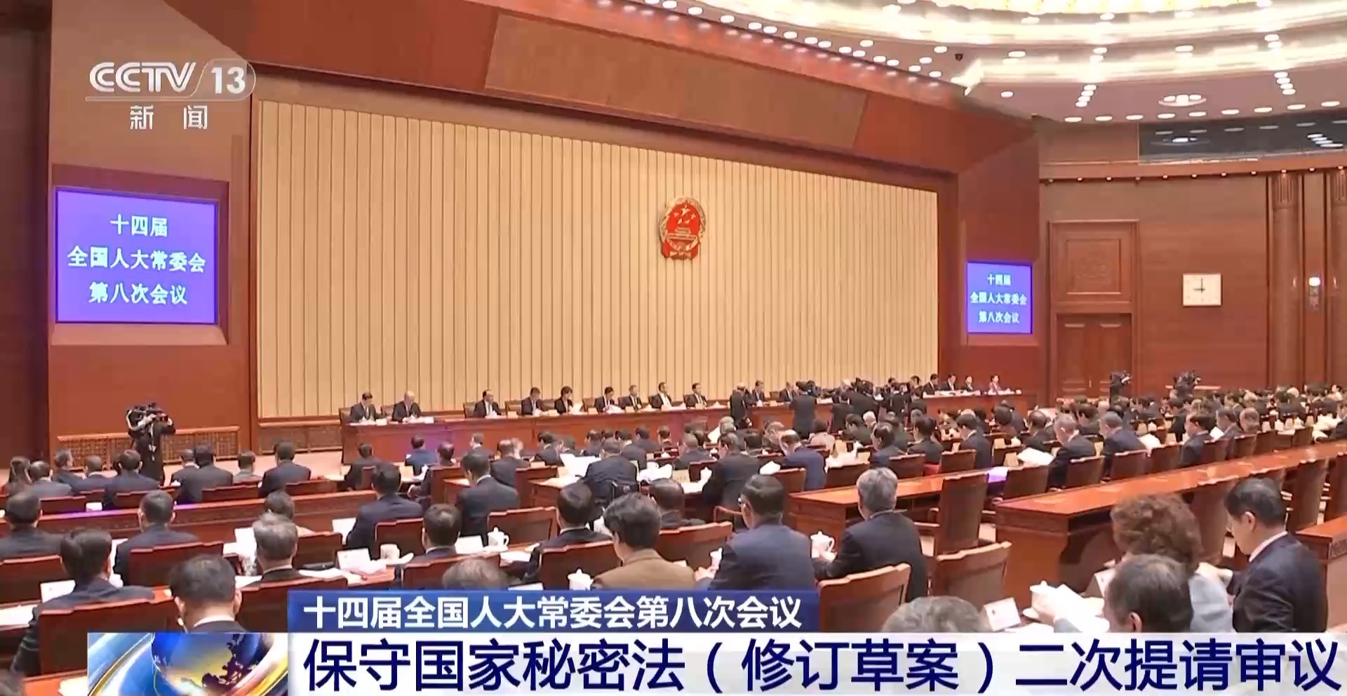 十四届全国人大常委会第八次会议今天(26日)上午在北京人民大会堂举行第一次全体会议。保守国家秘密法(修订草案)二审稿提请审议。草案二审稿完善确定保密事项范围的原则,进一步规范定密权限等内容。