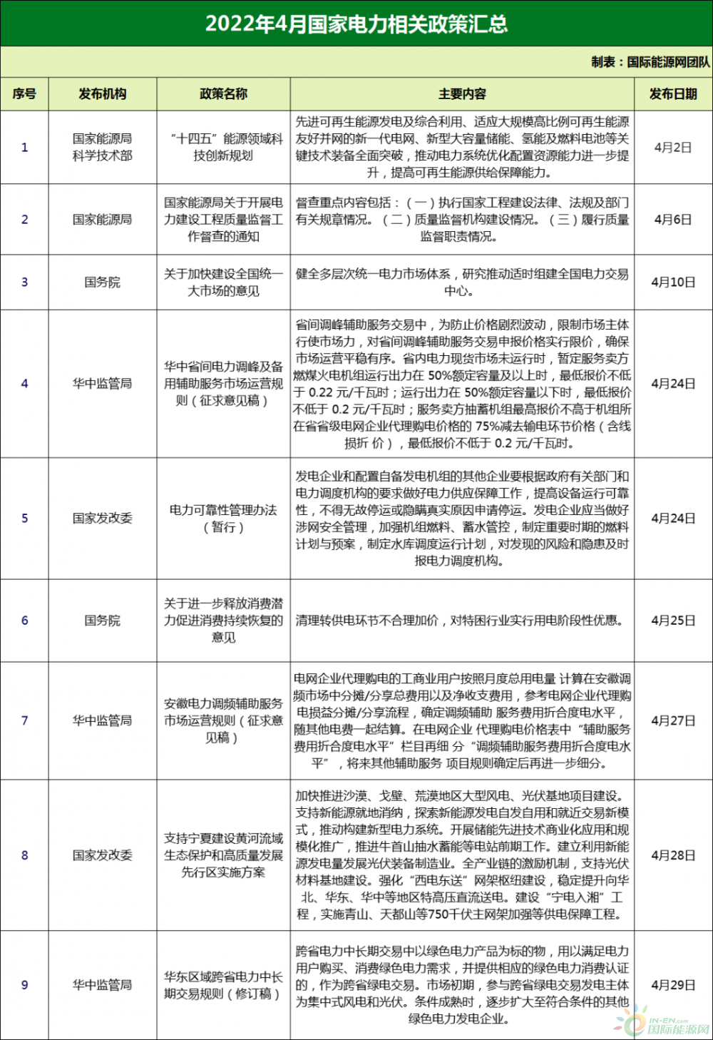 据国际能源网(微信号inencom)统计,2022年4月,国家层面一共发布了9项与电力相关的政策。其中4月10日,国务院发布的《中共中央 国务院关于加快建设全国统一大市场的意见》要求,健全多层次统一电力市场体系,研究推动适时组建全国电力交易中心。这为我国电力市场体系建设指明了方向。我国自2015年开启新一轮电力体制改革以来,完善电力市场建设就一直是改革的重中之重。