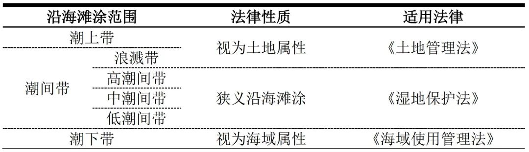 国家机构改革有效化解了相关部门沿海滩涂开发利用管理的土地和海域之争,由自然资源部统一行使职责。但在现行法律适用上,并没有专门的沿海滩涂立法。在适用法律时,应考虑到沿海滩涂的变动性与复杂性,在现行法律框架下应分别适用。实际上,沿海滩涂属于土地抑或是海域的争论焦点在于潮间带的属性问题。在法律适用上,对于潮上带和浪溅带,应当视为陆地,适用《土地管理法》。而潮下带视为海域属性,适用《海域使用管理法》。对于狭义的沿海滩涂,则应认定其具有独立属性,等同于滨海湿地[注19]适用《湿地保护法》。