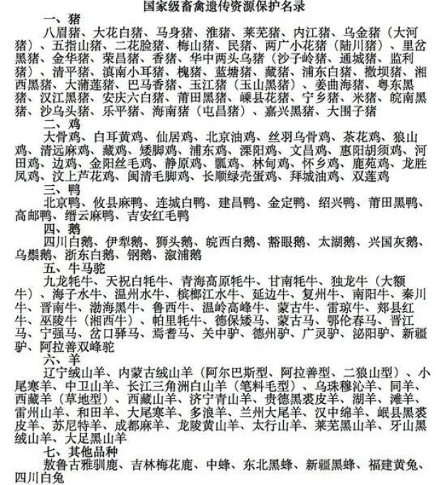 根据《国家级畜禽遗传资源保护名录》,猪、鸡、鸭、鹅、牛马驼、羊和其他品种,包括敖鲁古雅驯鹿、吉林梅花鹿、中蜂、东北黑蜂、新疆黑蜂、福建黄兔、四川白兔可食用。