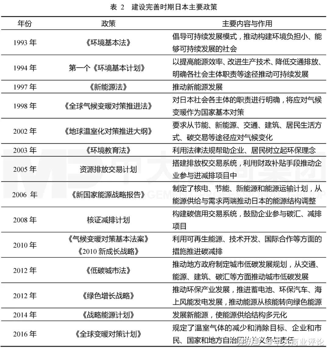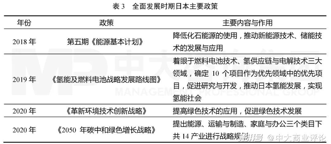 日本在这一阶段内与美国和欧盟做法相似,利用政策引导行业企业发展,同时发挥市场化机制的作用,调动企业积极性,从企业层面推动绿色技术创新与应用,维持核心技术优势,不断推进绿色产业发展。