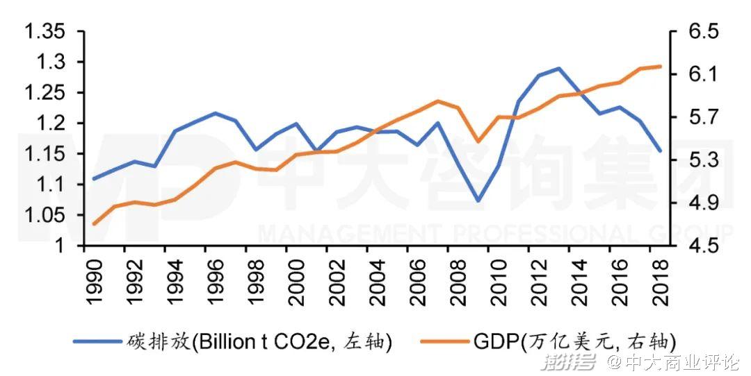 图4 1990年至2018年日本碳排放与GDP走势。注:数据来源于Climate Watch和世界银行