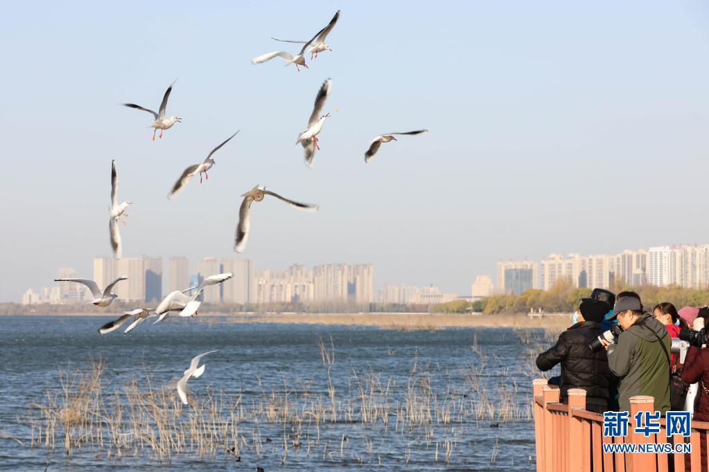 2022年12月1日,市民在河南省平顶山市白龟湖国家湿地公园观赏红嘴鸥。(图片来源:新华社)