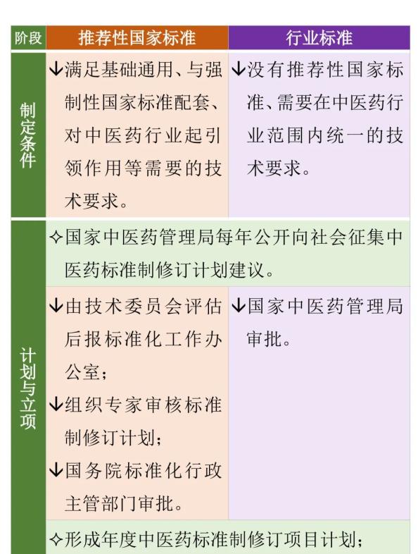 对满足基础通用、与强制性国家标准配套、对中医药行业起引领作用等需要的技术要求,可以制定中医药推荐性国家标准。对没有推荐性国家标准、需要在中医药行业范围内统一的技术要求,可以制定中医药行业标准。