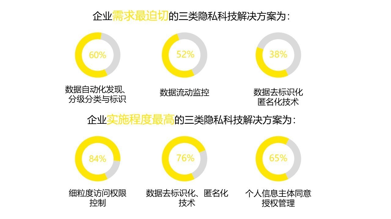隐私科技实施程度最高的前三类解决方案是细粒度访问权限控制,数据去标识化、匿名化工具和个人信息主体同意授权管理。然而需求最迫切的前三类为数据自动化发现、分级分类与标识、数据流动监控和数据去标识化、匿名化技术。