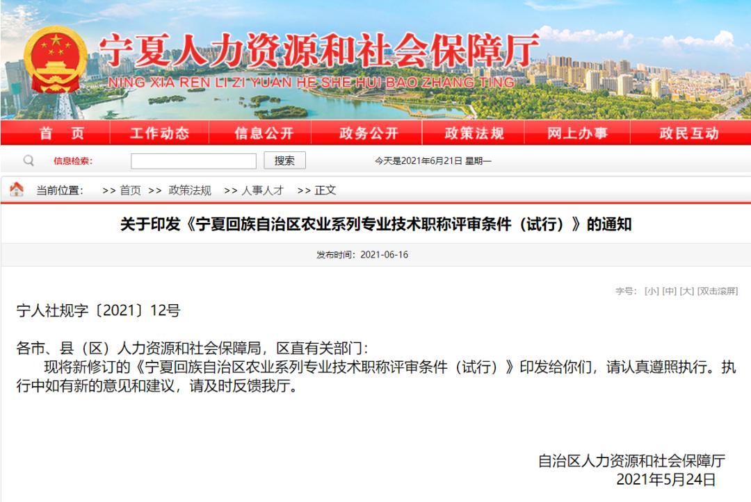 关于印发《宁夏回族自治区农业系列专业技术职称评审条件(试行)》的通知