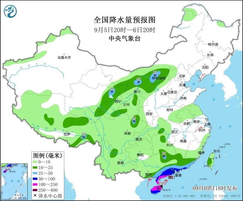 全国天气:内蒙古河套地区、青海东北部、广东中南部、广西东南部、海南岛等地部分地区有大到暴雨,其中,广东西南部沿海、海南岛中北部等地部分地区有大暴雨,海南岛东北部局地特大暴雨(250~290毫米)。上述部分地区伴有短时强降水(最大小时降雨量50~80毫米,局地可超过100毫米)。辽东半岛、浙江北部等地部分地区有5~6级风。