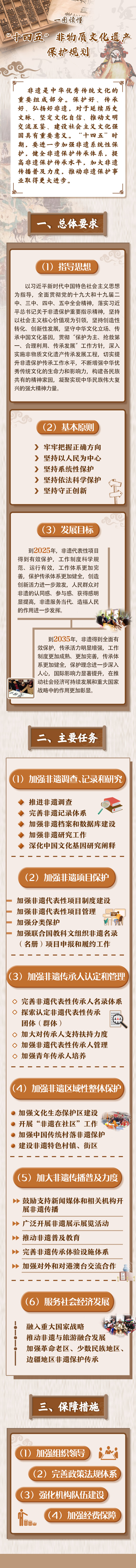 近日,文化和旅游部发布《“十四五”非物质文化遗产保护规划》(简称《规划》)。《规划》明确了“十四五”非物质文化遗产(简称“非遗”)保护的总体要求、主要任务和保障措施,系统部署“十四五”时期非遗保护工作。《规划》以习近平新时代中国特色社会主义思想为指导,把牢牢把握正确方向、坚持以人民为中心、坚持系统性保护、坚持依法科学保护、坚持守正创新作为基本原则,贯彻“保护为主、抢救第一、合理利用、传承发展”工作方针,提出了到2025年的发展目标和2035年的远景目标。《规划》明确了加强非遗调查、记录和研究,加强非遗项目保护,加强非遗传承人认定和管理,加强非遗区域性整体保护,加大非遗传播普及力度和服务社会经济发展6个方面主要任务,并通过8个专栏对传统工艺高质量发展、文化生态保护区建设等重点工作进行了部署。《规划》从加强组织领导、完善政策法规体系、强化机构队伍建设、加强经费保障4个方面保障各项措施的落实,推动形成有利于非遗保护传承的体制机制和社会环境。