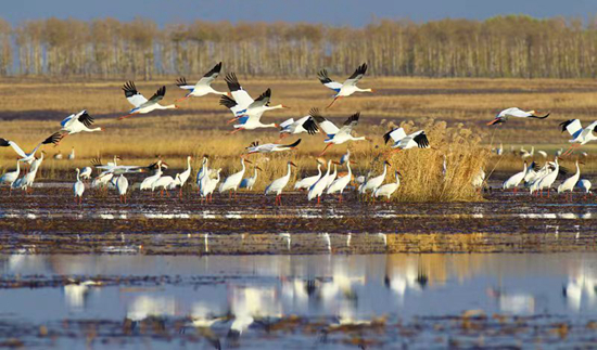 秋季在莫莫格湿地停歇的白鹤。潘晟昱/摄