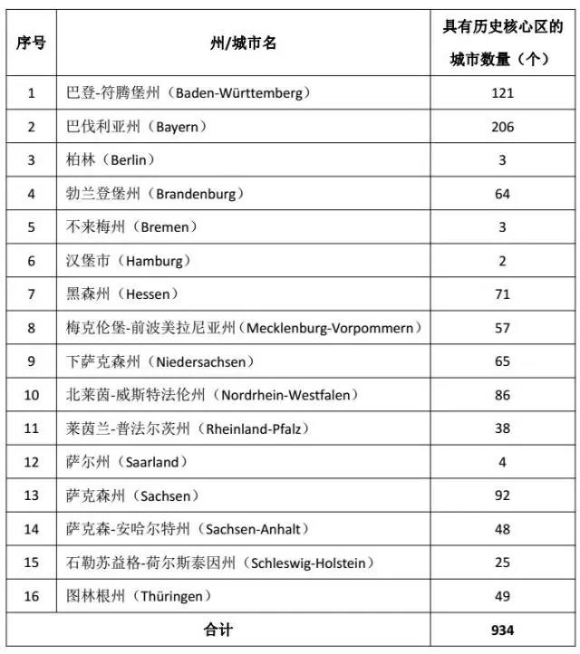 德国各州/城市“具有历史核心区的城镇”数量表