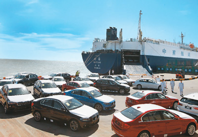 实行负面清单管理制度5年间,上海自贸试验区吸引合同外资超千亿美元。图为在位于上海临港新城的自贸试验区滚装码头上,工作人员将卸下船的车辆开到码头指定停车场。新华社记者 方 喆摄