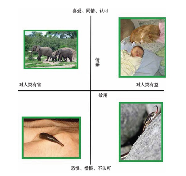我站在西方视角,使用了“我们”这个词,这是我的文化背景使然。当然,不同文化背景的人看待动物的方式是截然不同的。宾夕法尼亚大学的人与动物关系学家詹姆斯·瑟普尔提出了一个简单的模型来解释人类在如何看待动物上的文化差异。他认为我们的态度可归结为两个维度。第一个维度是情感——我们对动物情感感受,包括我们是否认同动物。第二个维度是效用——我们认为动物对我们有用还是有害。任何动物都可以被放在一个平面坐标系中,该坐标系的四个象限是由代表着效用的水平线与代表着情感的垂直线构成。动物在这个坐标系所处的位置会随着文化的差别而发生很大的变化。