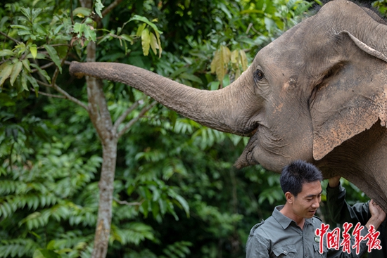 6月18日,野象谷景区内的亚洲象种源繁育及救助中心,工作人员熊朝永和被救助的亚洲象在一起。救助中心的11头亚洲象的饮食起居由27位工作人员轮班负责。本版图片由中青报·中青网记者 李隽辉/摄