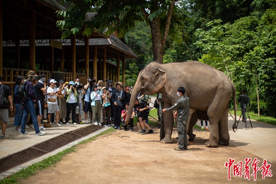 6月17日,野象谷景区内的亚洲象种源繁育及救助中心,媒体进行拍摄。