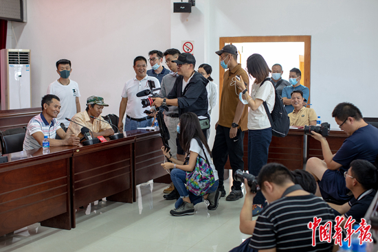 6月14日,“亚洲象北迁及生物多样性保护集中采访活动媒体座谈会”上,来自全国各地的媒体记者对两名野生亚洲象监测员进行采访。